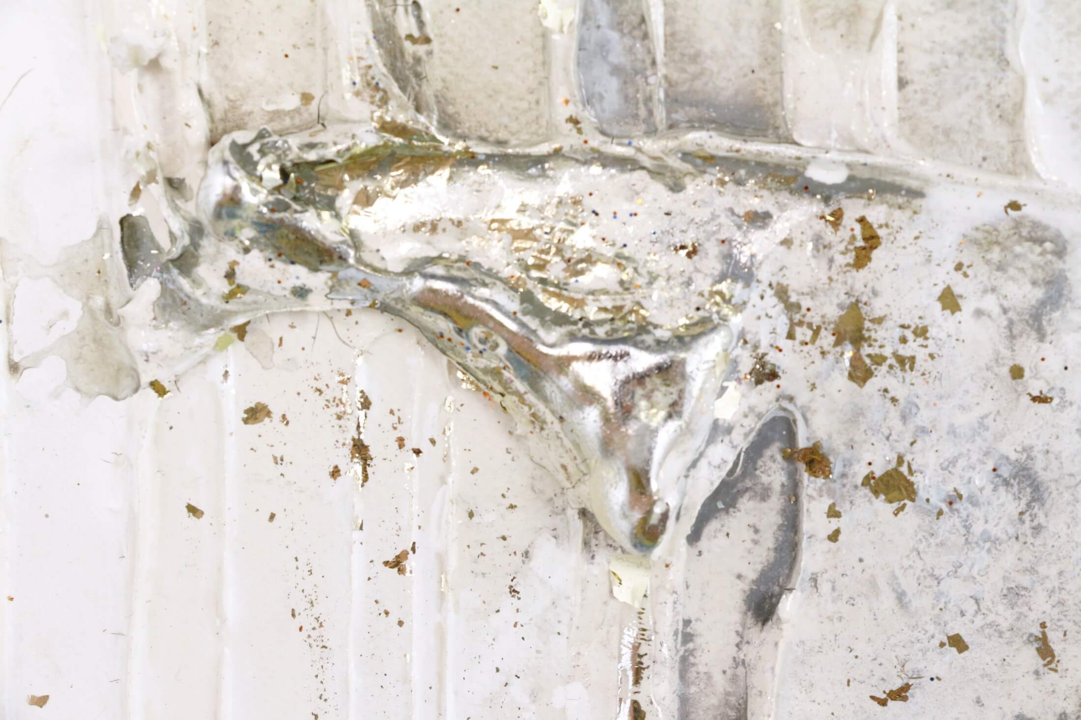 Iven Orx & Aaron Vinn, ETHEREAL SHEEN, Werkgruppe VEIL, 2024, Farbe, Weissgold auf Leinwand, 60 x 150 x 5 cm