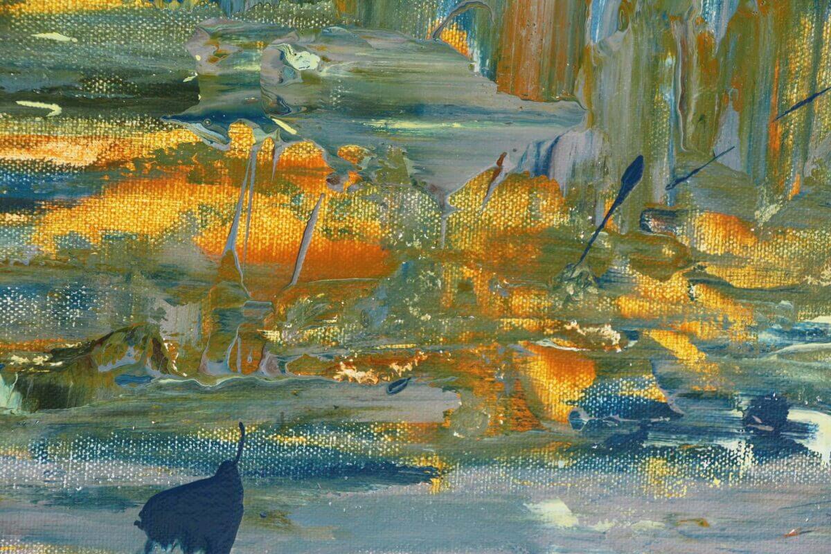 Aus der Materialität selbst erwächst Tiefe. Sie entsteht nicht durch Illusion, sondern durch Verdichtung – durch das Ineinanderfließen von Dichte und Transparenz, von Glanz und Stille. Das Auge tastet über diese Zonen wie über geologische Formationen, in denen Zeit sedimentiert ist.