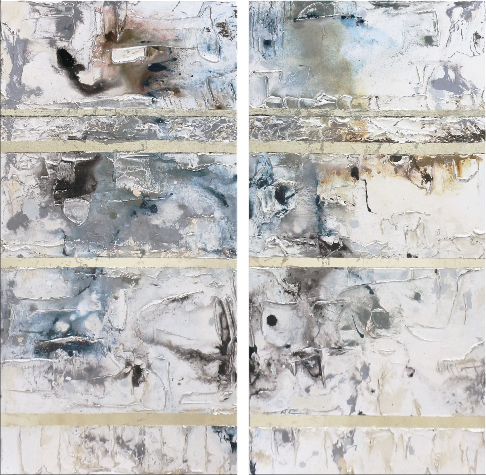 Iven Orx und Aaron Vinn erschaffen hier Werke, die sich nicht binden lassen. Blattmetalle fangen Licht ein, verschlucken es, geben es veränderter zurück. Strukturen ragen auf, vergehen, kehren wieder, als wären sie Fragmente einer verborgenen Ordnung, eingebunden in einen ewigen Fluss. Weiß ist hier keine Farbe, sondern ein Zustand – mal schwer und verdichtet, mal so lichtdurchlässig, dass es sich beinahe auflöst. Der Blick des Betrachtenden taucht ein, verliert den Boden, wird umhüllt von einer Wahrnehmung, die sich mit jeder Bewegung wandelt.